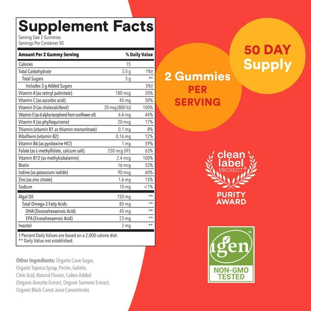 - Contiene 16 nutrientes para apoyar el crecimiento corporal, incluidas las vitaminas B12, A, E, K1, yodo y Omega-3 DHA de aceite de algas.